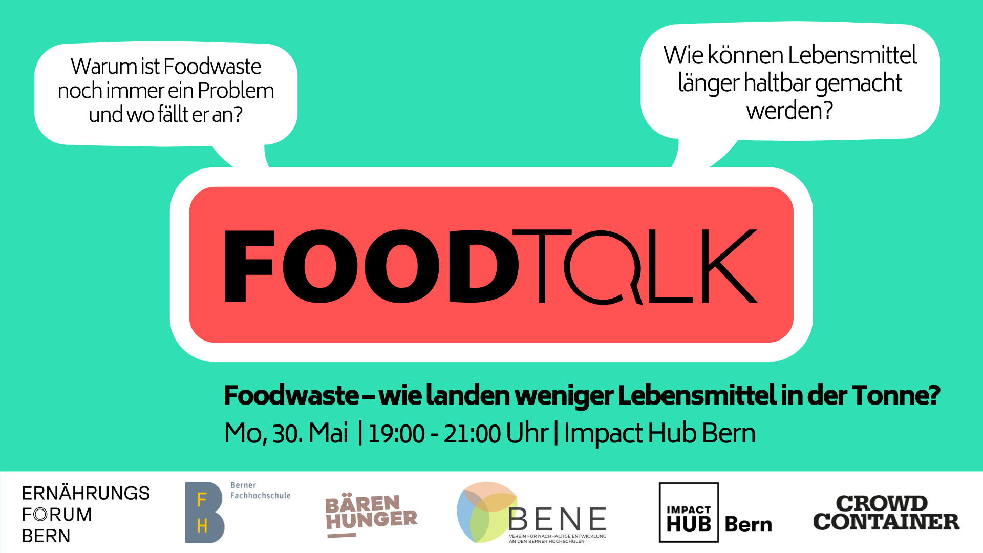 Der FoodTalk wird gemeinsam organisiert von Crowd Container, dem Ernährungsforum Bern, Bärenhunger, BENE (Verein für Nachhaltige Entwicklung an den Berner Hochschulen), der BFH-HAFL (Hochschule für Agrar-, Forst- und Lebensmittelwissenschaften) und dem Impact Hub Bern.