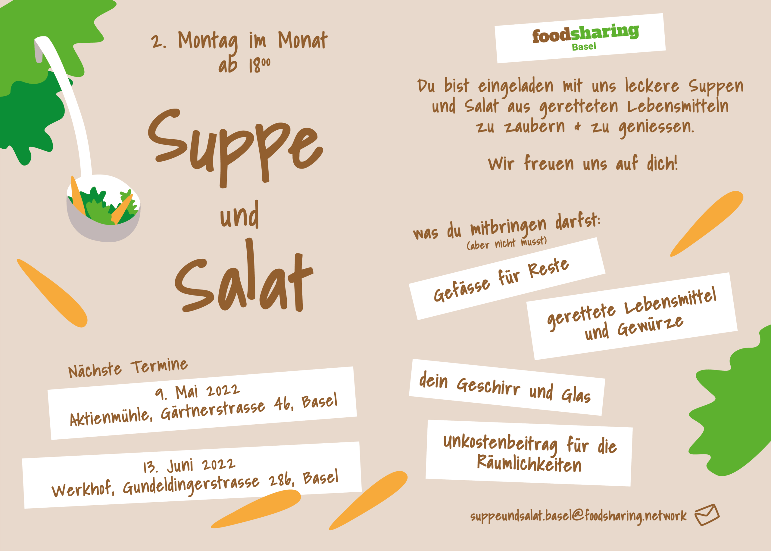 Du bist eingeladen mit uns leckere Suppen und Salat aus geretteten Lebensmitteln zu zaubern und zu geniessen. Wir freuen uns auf dich!
